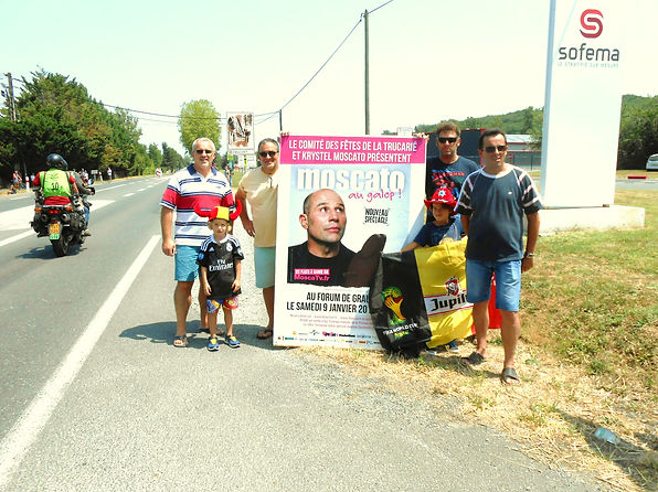 Le Tour de France est passé à Graulhet : Une partie du comité était là à coté de l'affiche du Spectacle de VINCENT MOSCATO , photo et video à l'appui :